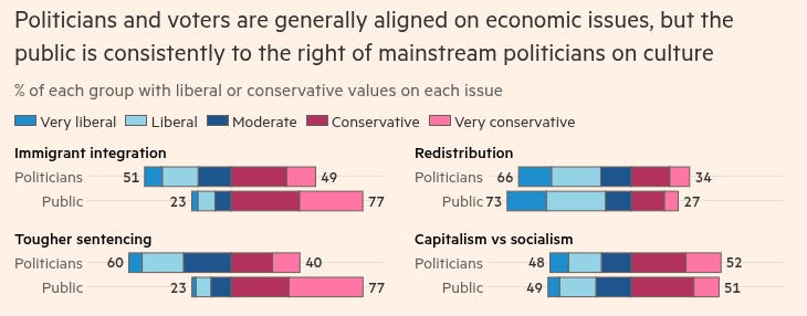 Here is yet another (!) fascinating piece by John Burn Murdoch in the FT exploring how voters and politicians are mismatched on political issues. He finds that the political class and the population are on the same page on economic issues but there is a significant disparity in their attitudes to cultural issues like immigration: