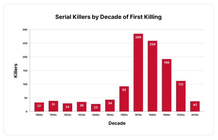 As an archetype, the serial killer seems like a classic fixture of American life. But as an actual phenomenon, it’s much more faddish than you’d think. According to the Radford University Serial Killer Database, the number of serial killers in the U.S. increased by a factor of 10 between the 1940s and the 1970s. Just as quickly as it emerged, it dissipated. By the 2010s, the number of serial killers had crashed 80 percent from its peak.