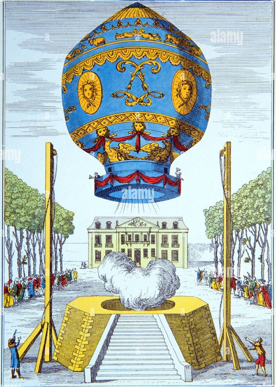 When I was a child I was enraptured by the Montgolfiers’ pioneering balloon (pictured above). There was an illustration of one in a book I had (possibly the Ladybird history of flight) and something about the way it was decorated with the golden face of the sun on a sky blue background gave me a strange feeling of sublimity and mysticism.